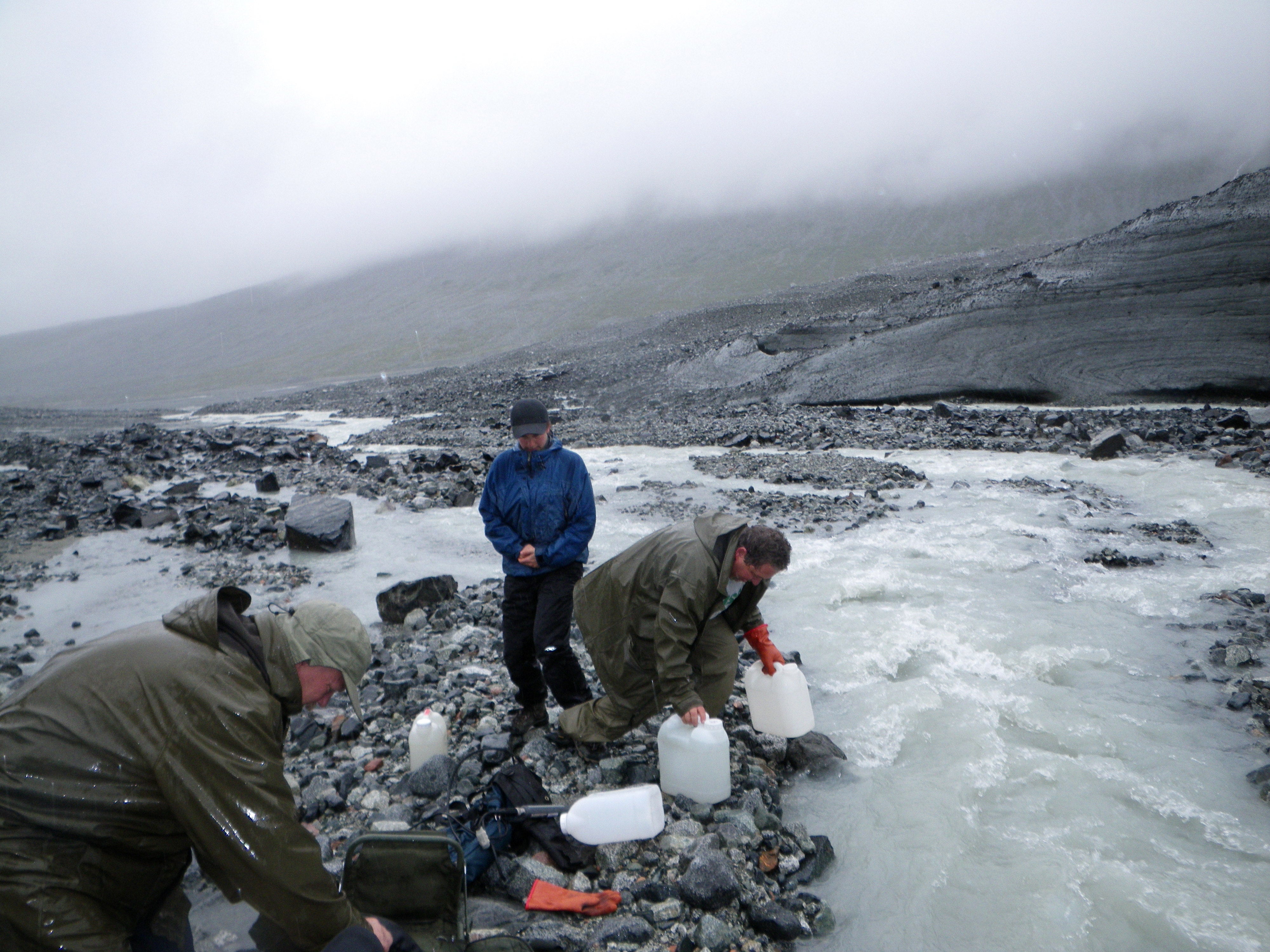 Gulkana Glacier meltwater sampling in Alaska for dissolved organic carbon and other chemical analyses at USGS laboratories in Boulder, Co. See related publications here. (Photo credit: Rob Striegl, USGS.)