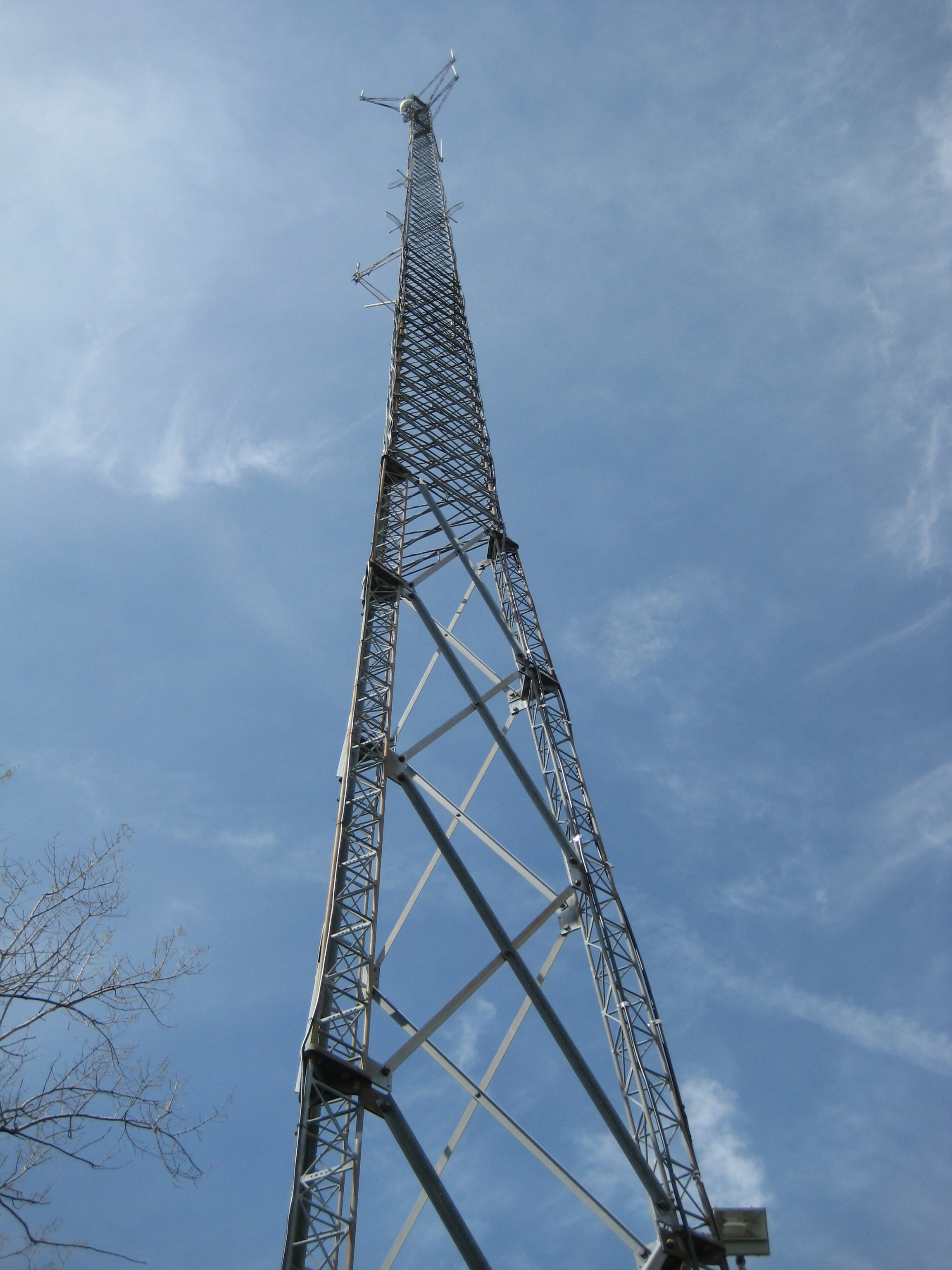Tower at which greenhouse gases are measured as part of the Indianapolis Flux Expriment (INFLUX). INFLUX was designed to develop and evaluate methods for measurement and modeling of greenhouse gas fluxes in urban invironments. Determination of these fluxes and their uncertainty bounds is essential for the evaluation of the effectiveness of mitigation strategies. The current INFLUX ground-based observation network includes twelve in-situ tower-base, continuous measurements of a combination of CO2, CO, and CH4, in addition to a suite of other measurements, data products, and modeling efforts. INFLUX in funded by the National Insitute of Standards and Technology (NIST). See more information. (Photo credit: N. Miles.)