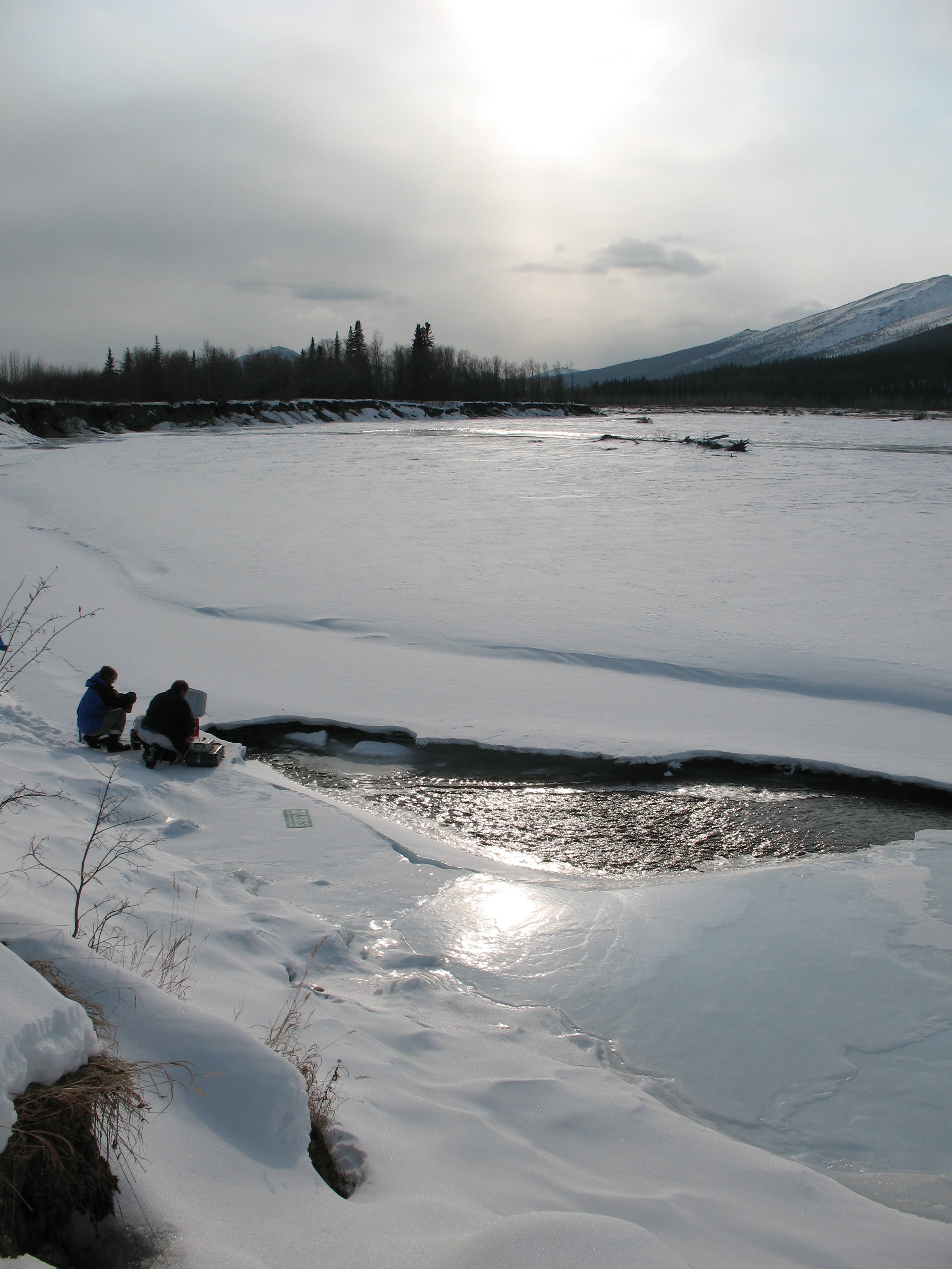 Scientists sampling dissolved organic carbon and carbon dioxide in the Koyukuk River, Alaska. (Photo credit: Mark Waldrop, USGS)
