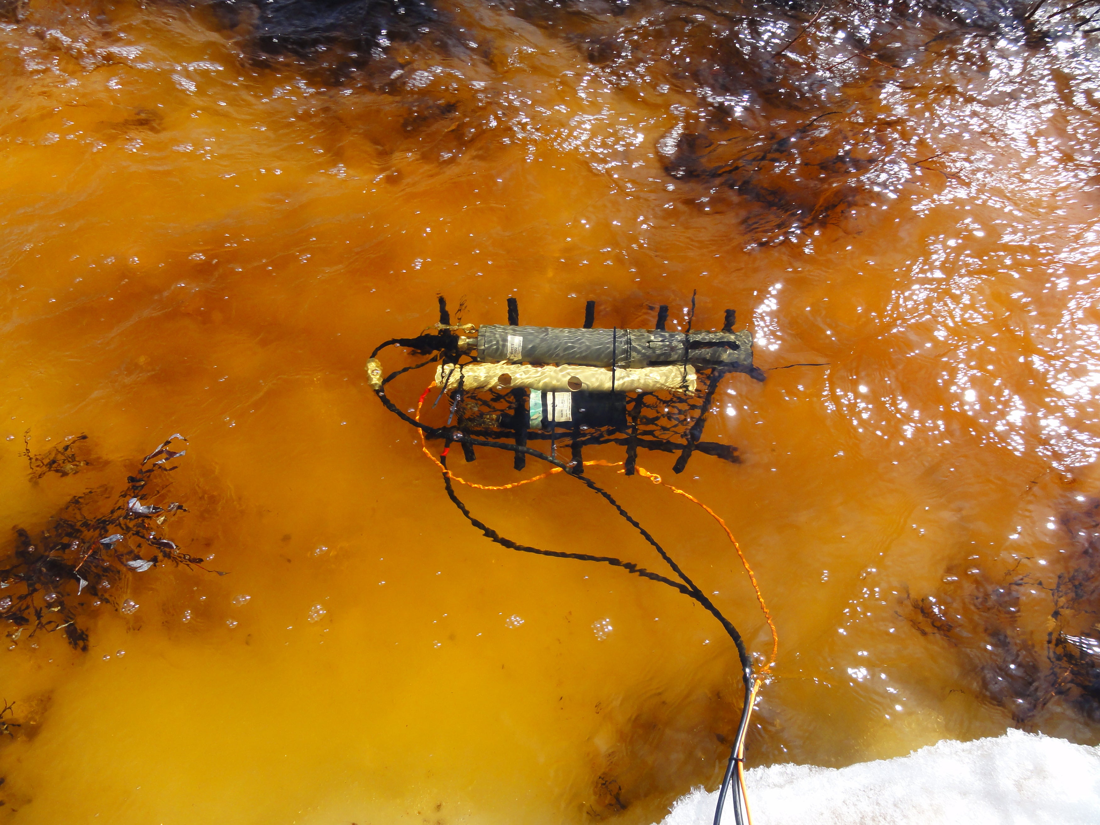 Sensors deployed by USGS in West Twin Creek, Alaska measuring dissolved organic carbon, dissolved carbon dioxide, temperature, pH, and electrical conductivity of carbon rich runoff at ice melt. (Photo credit: Mark Dornblaser, USGS.)