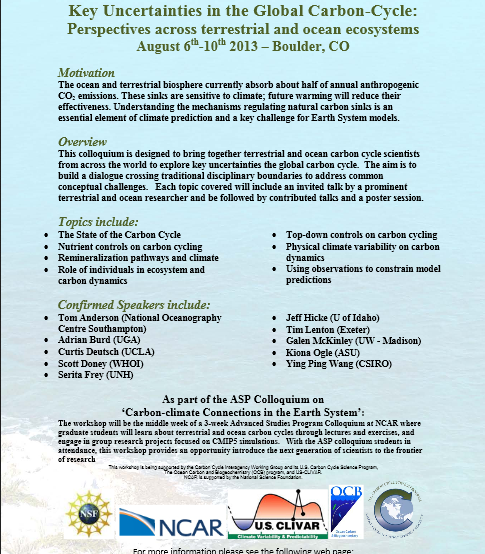 A workshop on 'Key Uncertainties in the Global Carbon-Cycle: Perspectives across terrestrial and ocean ecosystems' will be held from August 6-10, 2013 at the National Center for Atmospheric Research in Boulder, CO. The workshop seeks to develop a multi-disciplinary approach to global carbon cycle science by integrating knowledge from both land and ocean communities. We are bringing in a great group of leading carbon-cycle scientists from both the marine and terrestrial communities during the middle week of the three-week ASP summer graduate student colloquium. The sessions and discussions will focus on key challenges facing both communities and the innovative approaches being taken to address these challenges. Topics include nutrient cycle controls on carbon cycling, remineralization pathways and controls, the role of individuals in ecosystem dynamics, the role of physical climate variability in carbon cycling, and the use of data to constrain climate feedbacks.